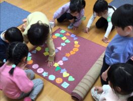 お友だちと一緒にすごろく作りをしました。三角やハート、星などの形に画用紙を型取って、「2ますすすむ」「もういっかいさいころをふってすすむ」など自分で考えたり、お...