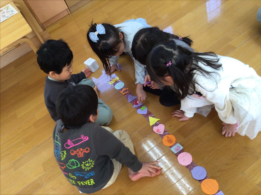 すごろく作り(4歳児:くじら組) ニュース2026年2月13日 お友だちと一緒にすごろく作りをしました。三角やハート、星などの形に画用紙を型取って、「2ますすすむ」「もういっかいさいころをふってすすむ」など自分で考えたり、お友だちと話しながら並べ方を決めて、楽しみました。