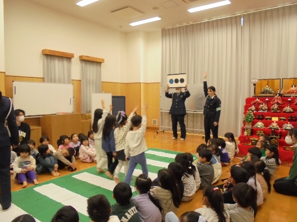 交通安全教室(3歳児:いるか組 4歳児:くじら組 5歳児:かもめ組) ニュース2026年2月26日 須磨警察の交通指導員の方に交通ルールについて教えていただきました。手品や腹話術で楽しく学ぶことができました。また、歩行訓練も行い、信号を見て横断歩道を渡る練習もしました。